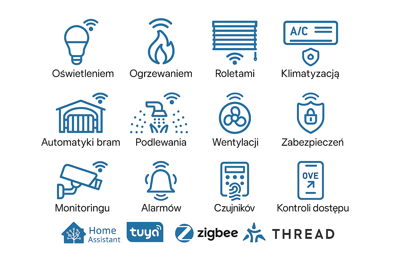 - sterowania oświetleniem, ogrzewaniem, roletami i klimatyzacją,